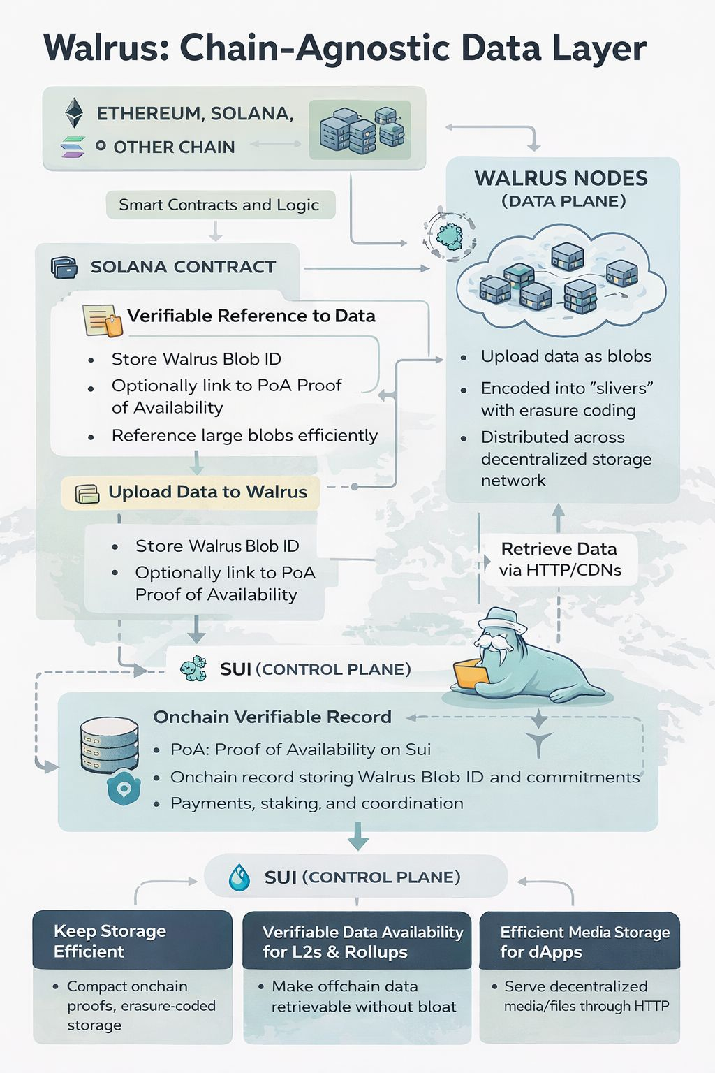 Most people first hear about @Walrus 🦭/acc described as “storage on Sui,” and mentally file it away as just another chain-specific infra project. That’s actually the least interesting way to think about it. What makes Walrus powerful and different is how it splits responsibilities across layers so cleanly that apps on Solana, Ethereum, or anywhere else can use it without dragging their whole stack onto Sui.