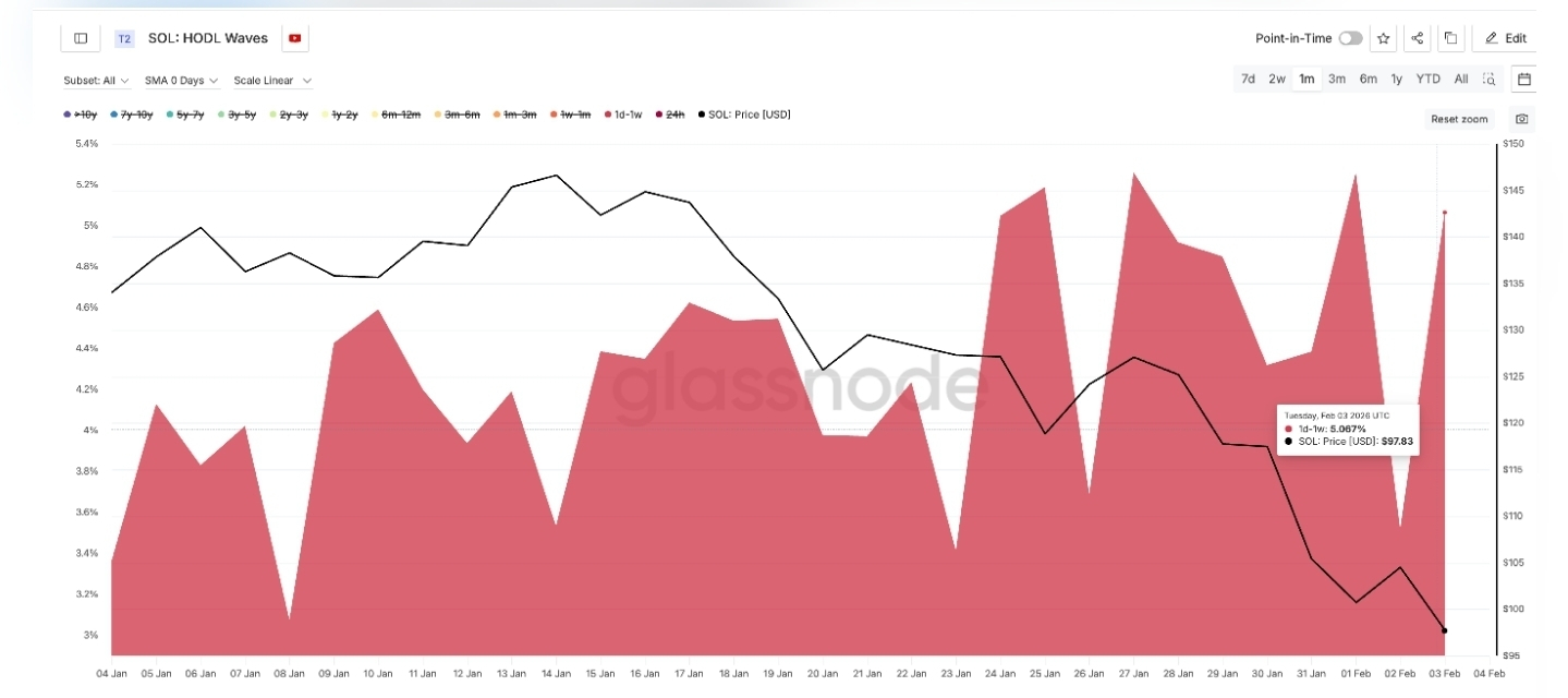 Os dados das HODL Waves, que rastreiam as carteiras pelo tempo que mantêm, mostram que o grupo de um dia a uma semana cresceu de 3,51% para 5,06% entre 2 e 3 de fevereiro. Esse segmento representa detentores de SOL de curto prazo que geralmente compram durante oscilações e vendem rapidamente.