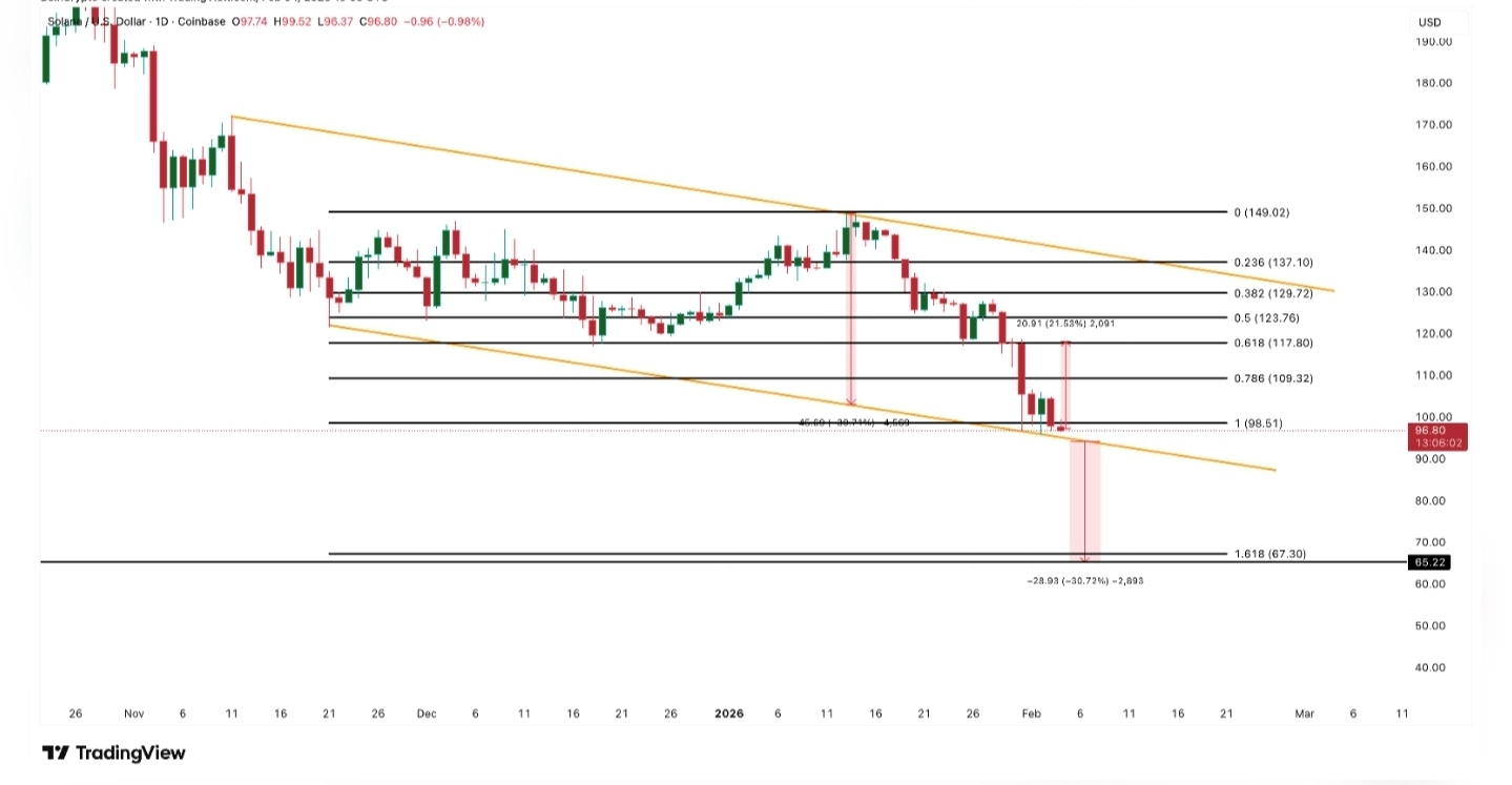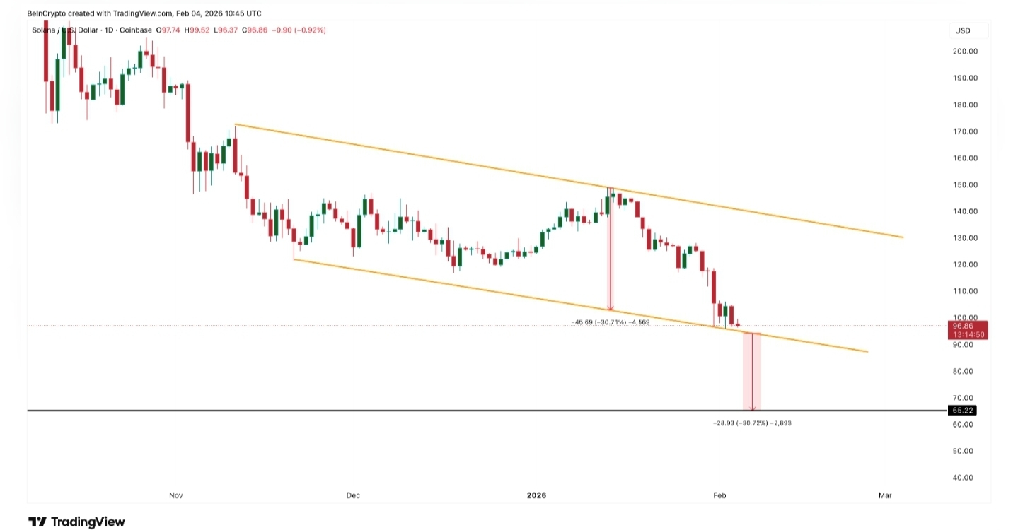 Os gráficos refletem a mesma fraqueza que os dados on-chain. O SOL ainda está preso em um canal de queda que empurrou os preços para baixo desde novembro. Depois de quebrar o suporte chave de 98 dólares, agora está em torno de 96 dólares, perto do fundo do canal.