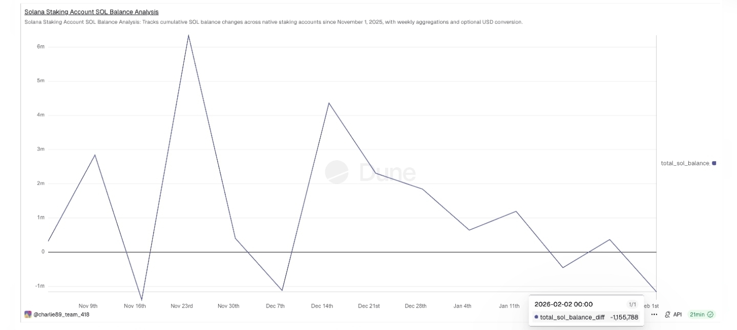 Esse momento mudou completamente. Em meados de janeiro, o staking começou a fluir para fora em vez de para dentro. Para a semana que terminou em 19 de janeiro, cerca de 449 mil SOL foram unstaked e em 2 de fevereiro esse número saltou para cerca de 1,15 milhão de SOL, significando que o unstaking cresceu cerca de 150 por cento em apenas duas semanas.