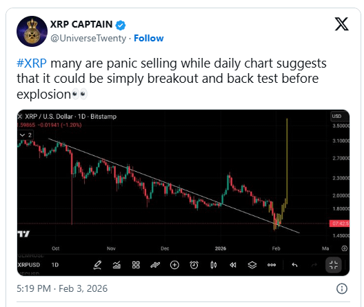 Ao se concentrar no período de tempo mais alto, o Capitão XRP sugere que a recente volatilidade pode ser mal interpretada como fraqueza, em vez de uma fase normal dentro de uma configuração técnica em desenvolvimento.