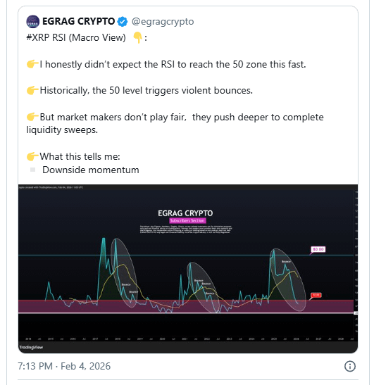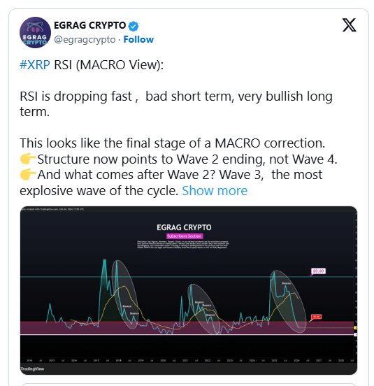 O analista de cripto Egrag Crypto entrou neste debate com uma interpretação focada em macro do comportamento técnico mais recente do XRP. Ele argumenta que a recente queda no momentum, óbvia no Índice de Força Relativa, reflete uma redefinição em vez de uma quebra estrutural. Ele acredita que a estrutura do mercado apoia uma tendência altista após a correção, mantendo o otimismo de longo prazo intacto, apesar da volatilidade atual.