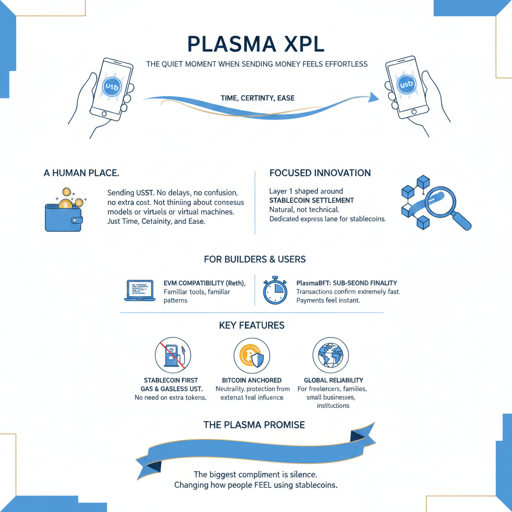 @Plasma $XPL starts from a very human place. The simple moment when someone opens a wallet to send USDT and hopes it reaches the other side without delay, confusion, or extra cost. No one in that moment is thinking about consensus models or virtual machines. They are thinking about time, certainty, and ease.