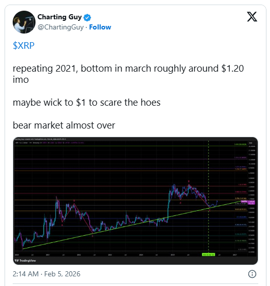 A perspectiva do Charting Guy se fortalece pela repetição estrutural nos ciclos do mercado de criptomoedas. Ao alinhar o comportamento atual do preço com a trajetória anterior do XRP, ele identifica condições que historicamente surgiram próximas aos fundos principais. Esses ambientes geralmente apresentam uma diminuição do momentum, volatilidade comprimida e pessimismo persistente logo antes da mudança na direção da tendência.