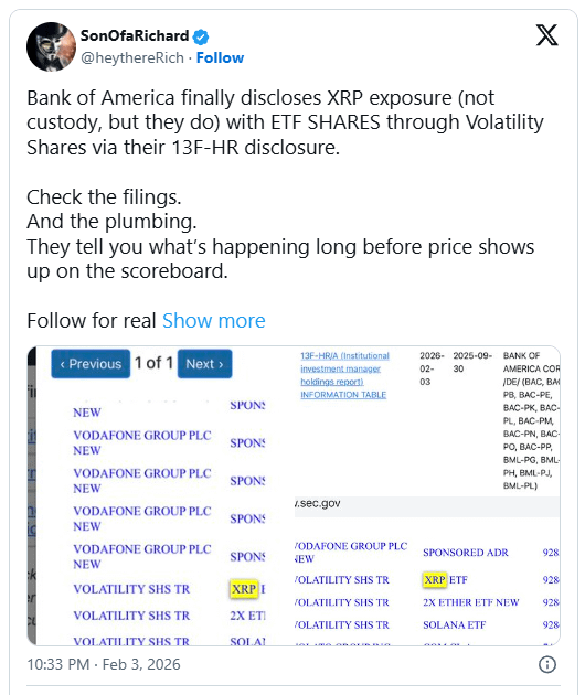 According to SonOfaRichard, the key point is not that Bank of America is holding XRP on its balance sheet, but that it has reported ownership of ETF shares that reference XRP exposure.