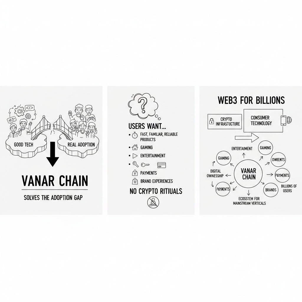 A Vanar Chain está tentando resolver um problema que a maioria das blockchains evita admitir, que é que “boa tecnologia” não é a mesma coisa que “adoção real”, porque os usuários comuns não acordam querendo um novo mecanismo de consenso, eles querem produtos que pareçam rápidos, familiares e confiáveis, e querem que esses produtos funcionem em jogos, entretenimento, propriedade digital, pagamentos e experiências de marca sem forçá-los a aprender os rituais da cultura cripto. A identidade da Vanar é construída em torno dessa realidade, e o projeto continua repetindo a mesma crença central de diferentes maneiras: se o Web3 vai alcançar bilhões de pessoas, ele precisa se comportar como tecnologia de consumo primeiro e infraestrutura cripto em segundo lugar, razão pela qual a Vanar se apresenta não apenas como mais um Layer-1, mas como um ecossistema projetado para verticais tradicionais onde a distribuição já existe.