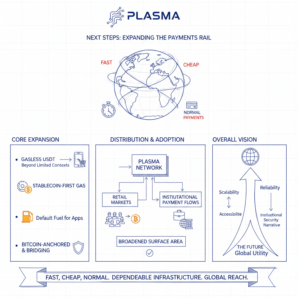 O que vem a seguir, se você seguir a lógica do que eles já construíram e do que dizem que querem, parece menos como "lançar outro recurso" e mais como expandir a área de superfície de um trilho de pagamentos até que se torne entediante da melhor maneira. Isso geralmente significa escalar a experiência de USD₮ sem gás além de contextos limitados, ampliando a adoção de gás primeiro em stablecoin para que os aplicativos possam padrão para combustível de stablecoin sem passos estranhos, e continuando a amadurecer a narrativa ancorada ao Bitcoin e a história de ponte para que a narrativa de segurança se torne algo que instituições possam citar com confiança, em vez de apenas uma posição filosófica. Também significa impulsionar a distribuição, porque uma rede de pagamentos sem distribuição é apenas uma demonstração tecnicamente impressionante, e a própria mensagem do Plasma torna difícil não perceber que eles estão mirando tanto em mercados de adoção de varejo quanto em fluxos de pagamento institucionais, em vez de apenas no público nativo de cripto.