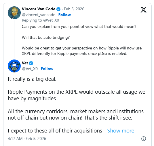 O validador do XRPL, Vet, destacou recentemente essa mudança ao discutir o impacto potencial de uma integração mais profunda entre a infraestrutura de pagamento da Ripple e a troca descentralizada do livro-razão. Seus comentários enquadram o momento como mais do que uma atualização rotineira, sugerindo que poderia redefinir como a liquidez institucional interage com o XRPL e expandir significativamente a atividade na cadeia ao longo do tempo.