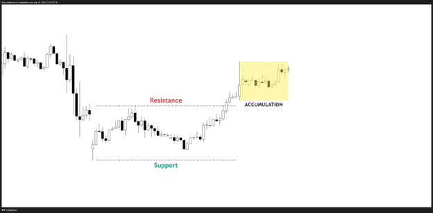 Durante a fase de Acumulação, o mercado negocia em uma faixa estreita enquanto os compradores constroem silenciosamente
