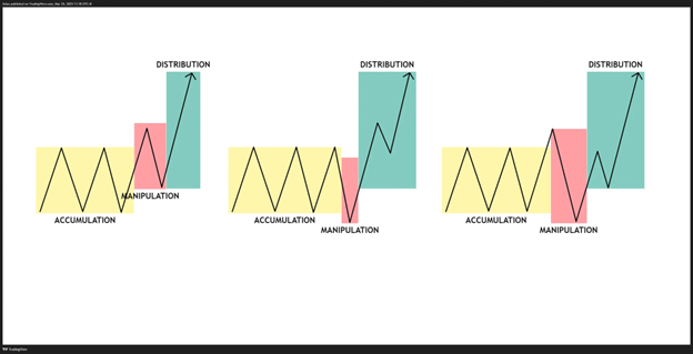Durante a fase de manipulação, o preço realiza um rompimento, mas recua para dentro da faixa, eliminando os fracos. Outro cenário são os preços quebrando para o lado oposto e rapidamente se revertendo para cima, eliminando ordens de stop loss de ambos os lados.