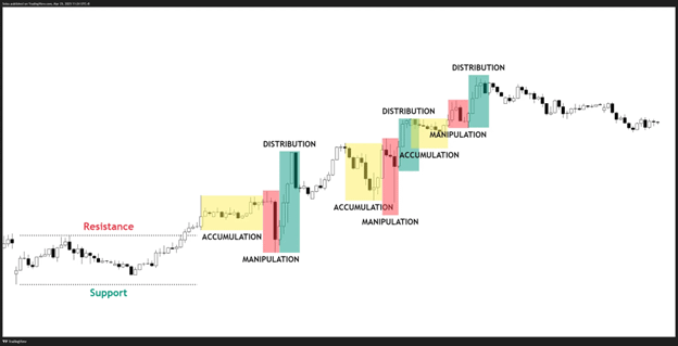 Finalmente, na fase de Distribuição, como a manipulação já foi feita e a liquidez necessária já foi acumulada, é aqui que queremos surfar onde o preço está agora pronto para seguir em uma direção específica.