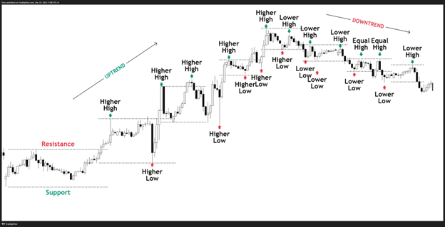 Quando você vê uma série de máximas mais altas (HHs) e mínimas mais altas (HLs), você sabe que os compradores estão no controle e o mercado está em uma tendência de alta. Por outro lado, máximas mais baixas (LHs) e mínimas mais baixas (LLs) indicam uma tendência de baixa. Em um mercado lateral ou de faixa, máximas iguais (EHs) e mínimas iguais (ELs) são óbvias, sugerindo nenhuma direção clara.