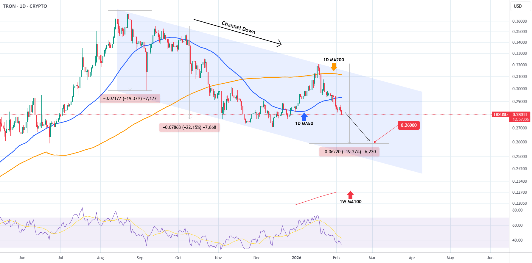 Tron (TRXUSD) tem negociado dentro de um Canal de Baixa de 6 meses desde seu pico em 14 de agosto de 2025 e agora já está na metade de sua 3ª Perna Baixa.