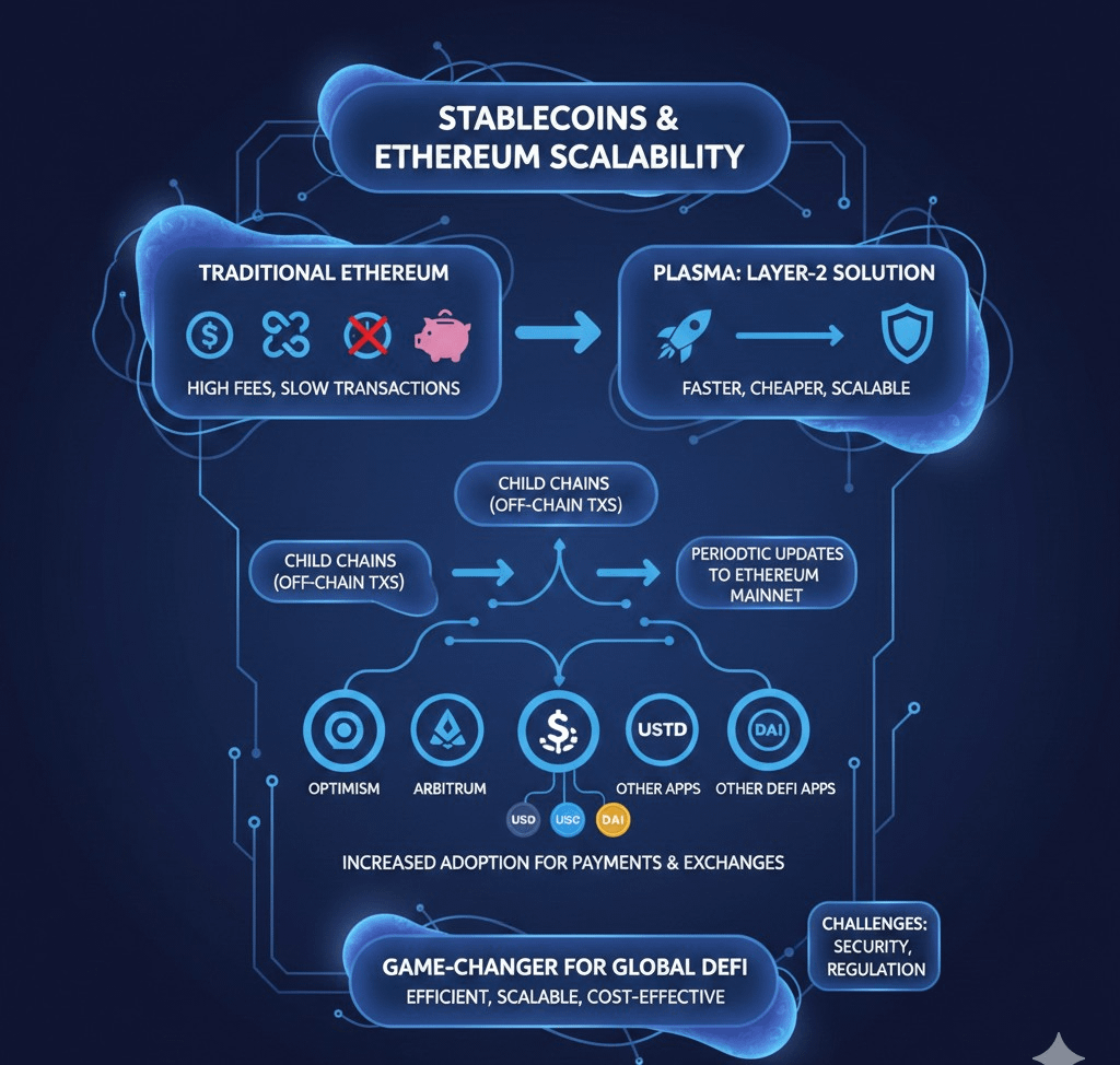@Plasma is designed to enhance Ethereum’s scalability by processing transactions off-chain while still relying on the security of the main Ethereum network. Plasma achieves this by using child chains, where transactions occur faster and cheaper, periodically sending updates back to Ethereum. This mechanism reduces the load on Ethereum’s mainnet, enabling quicker and more cost-efficient transactions, which is essential for stablecoin payments that require rapid processing.