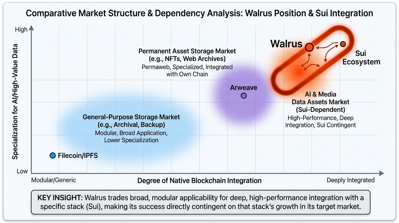 This exposes Walrus's critical dependency and its greatest strategic risk: the Sui blockchain. Walrus's design, where data availability proofs and access control contracts live natively on Sui, creates unparalleled efficiency for developers already in that ecosystem. The settlement is fast and the user experience seamless. However, this is a profound liquidity and adoption gamble. It chains Walrus's fate to Sui's success in attracting the very AI and media applications Walrus is built for. Should developer activity or value accreted on Sui plateau, Walrus becomes a world-class engine installed in a niche vehicle. The counter-argument that deep vertical integration is necessary to achieve the performance required for AI is valid. But from a trader's perspective, this makes analyzing Walrus inseparable from analyzing Sui's on-chain metrics: Total Value Locked (TVL) in DeFi is less important than the volume and value of data-rich transactions from non-speculative applications. One must watch for Sui-based AI agent platforms or media DAOs gaining traction; that is the true leading indicator for WAL utility.