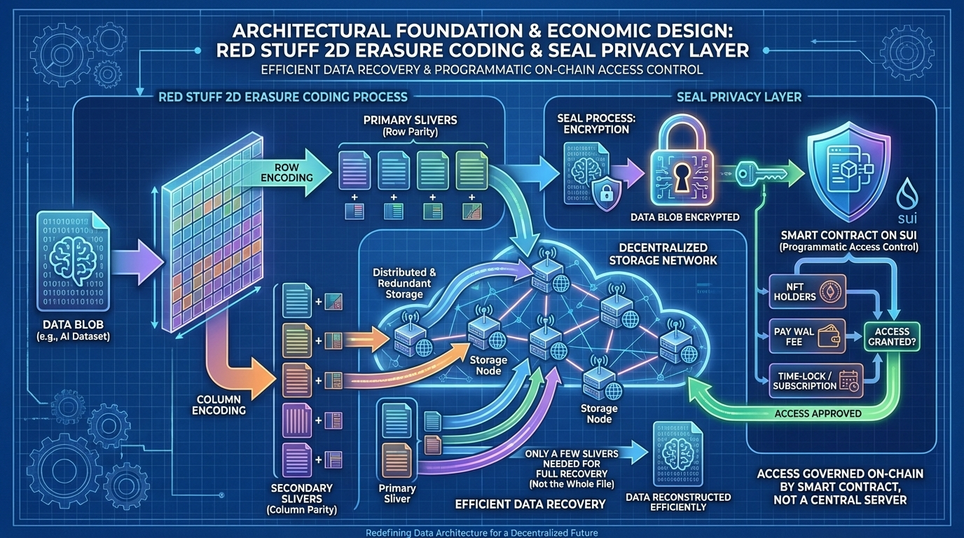 Red Stuff's two dimensional erasure coding is not just a technical improvement; it's a redesign of storage economics that directly dictates liquidity behavior for WAL. By encoding data across both rows and columns into "slivers," recovery of any lost data requires contacting only a small, predictable subset of nodes. This transforms the security model from a "trust-minimized but capital-heavy" replication game to a "cryptographically verifiable and capital-efficient" one. For a network operator, this means the capital required to participate as a storage provider is not tied to blindly replicating whole datasets but to providing robust bandwidth and compute for the encoding/decoding process. The consequence for WAL tokenomics is that staking rewards must incentivize a different kind of resource provision high-availability compute for coding not just raw hard drive space. This aligns validator economics more closely with the needs of the AI data consumer, who pays for retrieval speed and reliability, not just storage permanence.