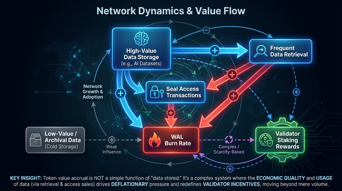 Finally, the market is completely overlooking the upcoming deflationary burn mechanism's dynamic. Unlike a simple burn tied to transaction volume, a burn tied to a storage network's core activity creates a non-linear relationship with network growth. As more high-value AI datasets are stored which are large and require frequent, paid access the burn rate accelerates. However, if the network is filled with low-value, "write-once, read-never" archival data, the burn stagnates. Thus, the token's scarcity is not a function of mere usage, but of the economic quality of the data stored. This makes analyzing on-chain metrics for Walrus uniquely nuanced. One must look beyond total petabytes stored and instead track metrics like "retrieval transaction volume" or "Seal contract interactions" to gauge the velocity of high-value data. A network at 50% capacity with high retrieval traffic is vastly more bullish for WAL scarcity than a network at 100% capacity that is dormant.