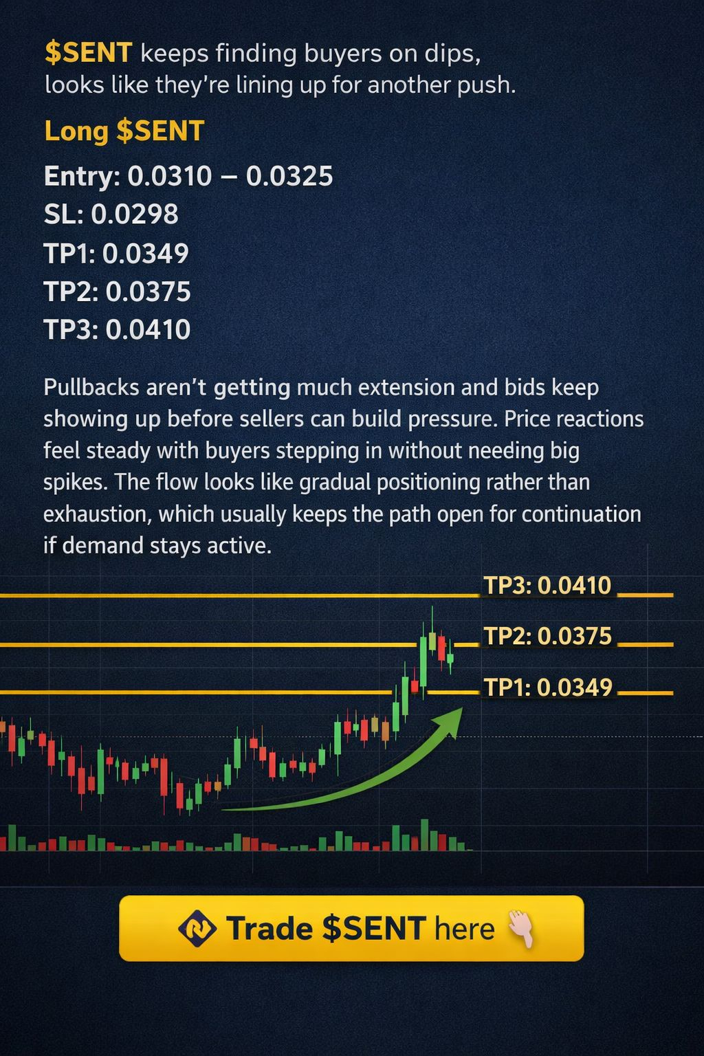 $SENT keeps finding buyers on dips, looks like they’re lining up for another push.