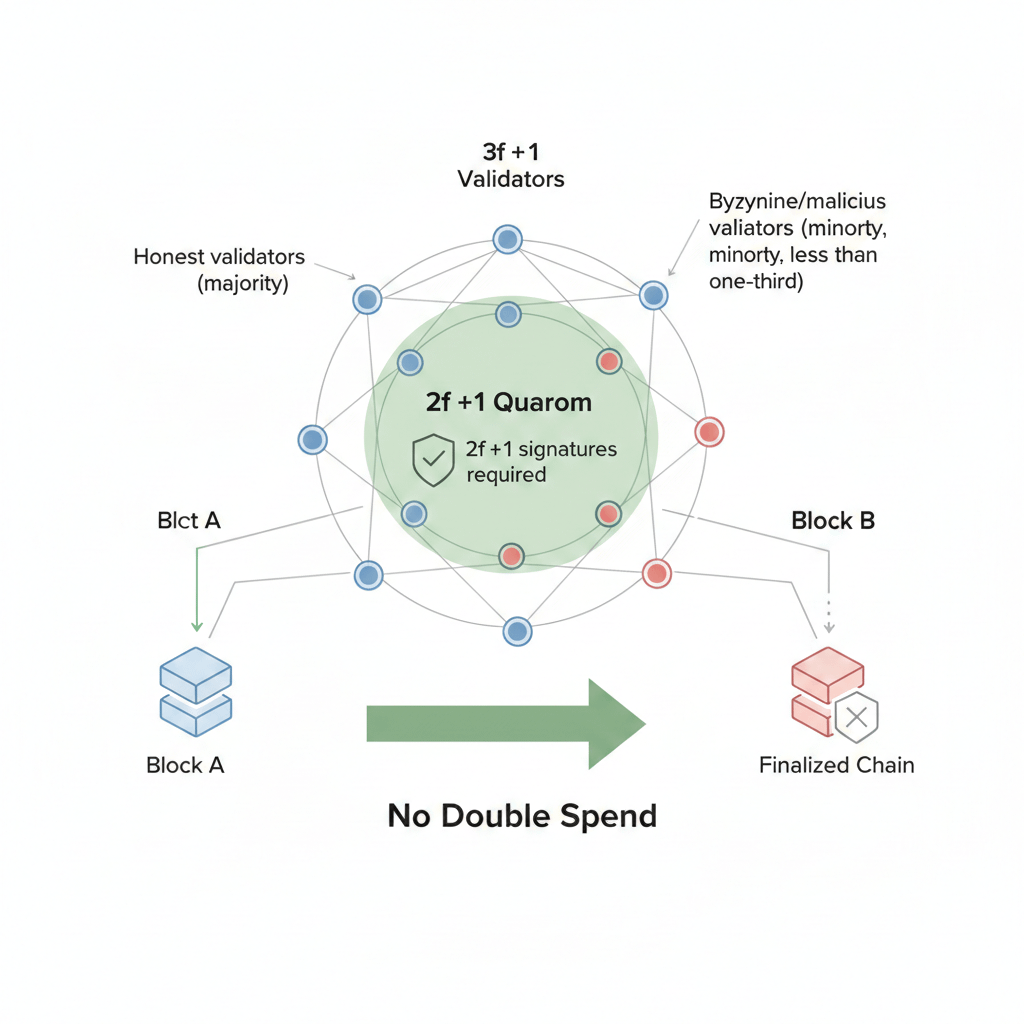 Uma vez que um bloco recebe um Certificado de Quorum válido e passa pela regra de compromisso, ele é final. Não há reorg. Nenhuma “espera por seis blocos.” Nenhuma ambiguidade.