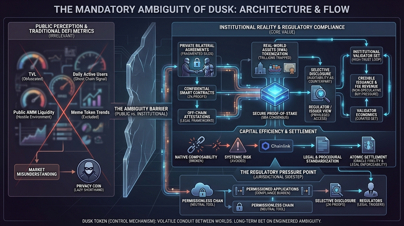 @Dusk is not a privacy coin in the conventional sense, and that is its only path to survival. The market, with its lazy shorthand, labels it as such a token for hiding transactions. This classification is a critical error in judgment, a misunderstanding that reveals a deeper market blindness to the only regulatory reality that matters: auditability is not the enemy of privacy; it is its necessary counterpart in any system that intends to interact with institutional capital. To analyze DUSK is to dissect a deliberately constructed paradox, a blockchain engineered for the specific, unglamorous tension between hiding value flows from the public and revealing them, on-demand, to a privileged, credentialed few. This is not monero for banks; this is a meticulous architectural play for the trillions trapped in pre-tokenized real world assets, and its success hinges on a validator economics model and a capital flow logic that is fundamentally alien to the DeFi-native crowd currently dominating sentiment.