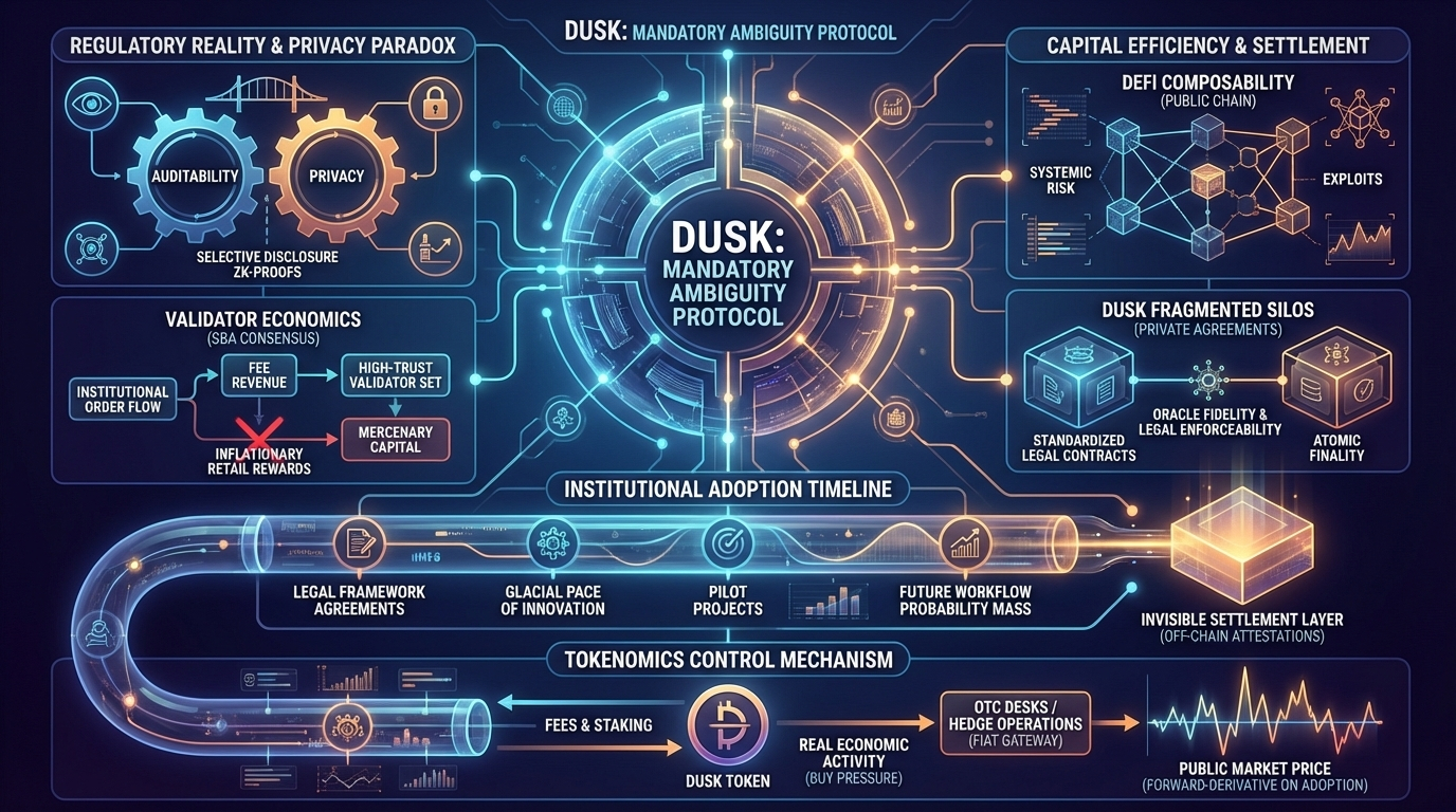 Finally, look at the tokenomics not as a reward schedule, but as a control mechanism for this long, fraught journey. The DUSK token is required for fees and staking. If the primary fee payers are intended to be institutions issuing assets, they must acquire DUSK, likely from the open market. This creates a direct, non speculative buy pressure tied directly to real economic activity on the chain. However, this also makes the token volatile and potentially expensive for their target users a problem. The likely, unspoken endgame is for major issuers or validators to run OTC desks or treasury operations to hedge their DUSK exposure, effectively creating a stable, institutional facing fiat to DUSK gateway that insulates them from crypto volatility. The public market token, then, becomes a forward derivative on the adoption of that private, institutional settlement layer. Its price discovery is forever imperfect, based on our noisy guesses about a silent, professional market forming in the shadows.