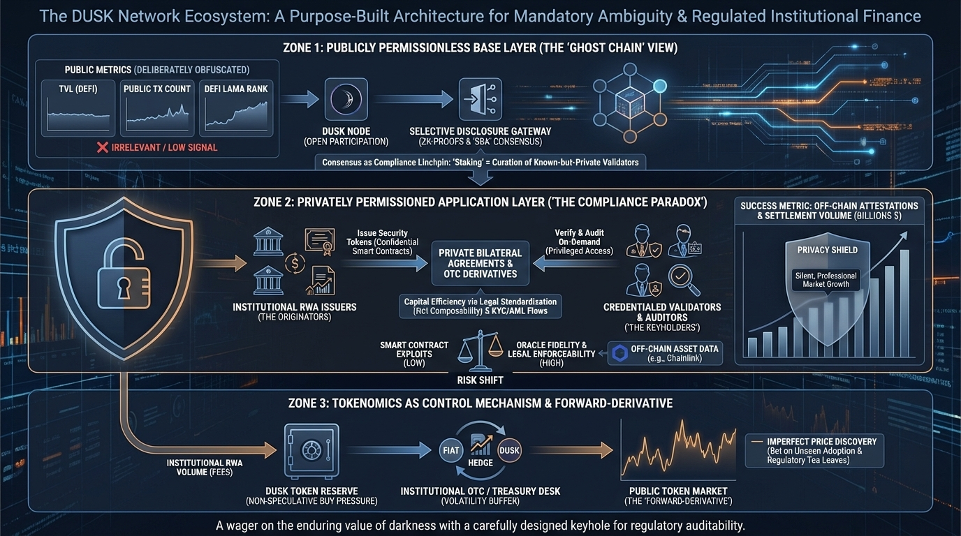 Let's begin by dismanting the primary narrative. The instinct of a trader is to look for liquidity magnets the applications that pull in TVL, the speculative loops that bootstrap a token economy. DUSK’s architecture is purposefully hostile to this model. Its confidential smart contracts, built around zero-knowledge proofs and a notion of selective disclosure, are not designed for public leverage farming or transparent Ponzi schemes. They are designed for private bilateral agreements, for over the counter derivatives, for the issuance of a digital bond where the ownership ledger is opaque but instantly verifiable by the issuer and a regulator. The liquidity here does not pool in a public AMM; it exists in fragmented, permissioned silos. This means the on-chain metrics we typically fetishize TVL, daily active addresses in the naive sense, transaction count are not just irrelevant; they are deliberately obfuscated. A thriving DUSK ecosystem could look like a ghost chain to Dune Analytics, while facilitating billions in security token settlements. The first lesson is to unlearn our public chain metrics. Success for DUSK is measured in off-chain attestations, in the signing of legal framework agreements with stock transfer agents, not in trending on DeFiLlama.
