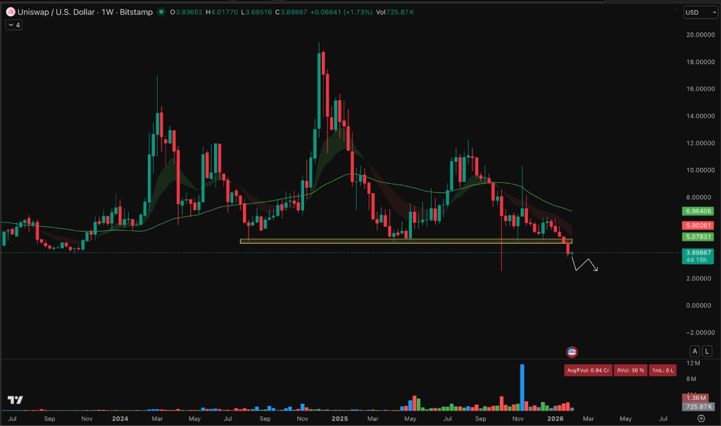 Uniswap (UNI), um dos principais projetos de blockchain no setor de troca descentralizada, perdeu todo o ímpeto nos últimos meses. UNI desafiou brevemente o nível de $6.5 no final de 2025, mas desde então colapsou para $3.9 e está lutando para encontrar suporte em torno desse nível.