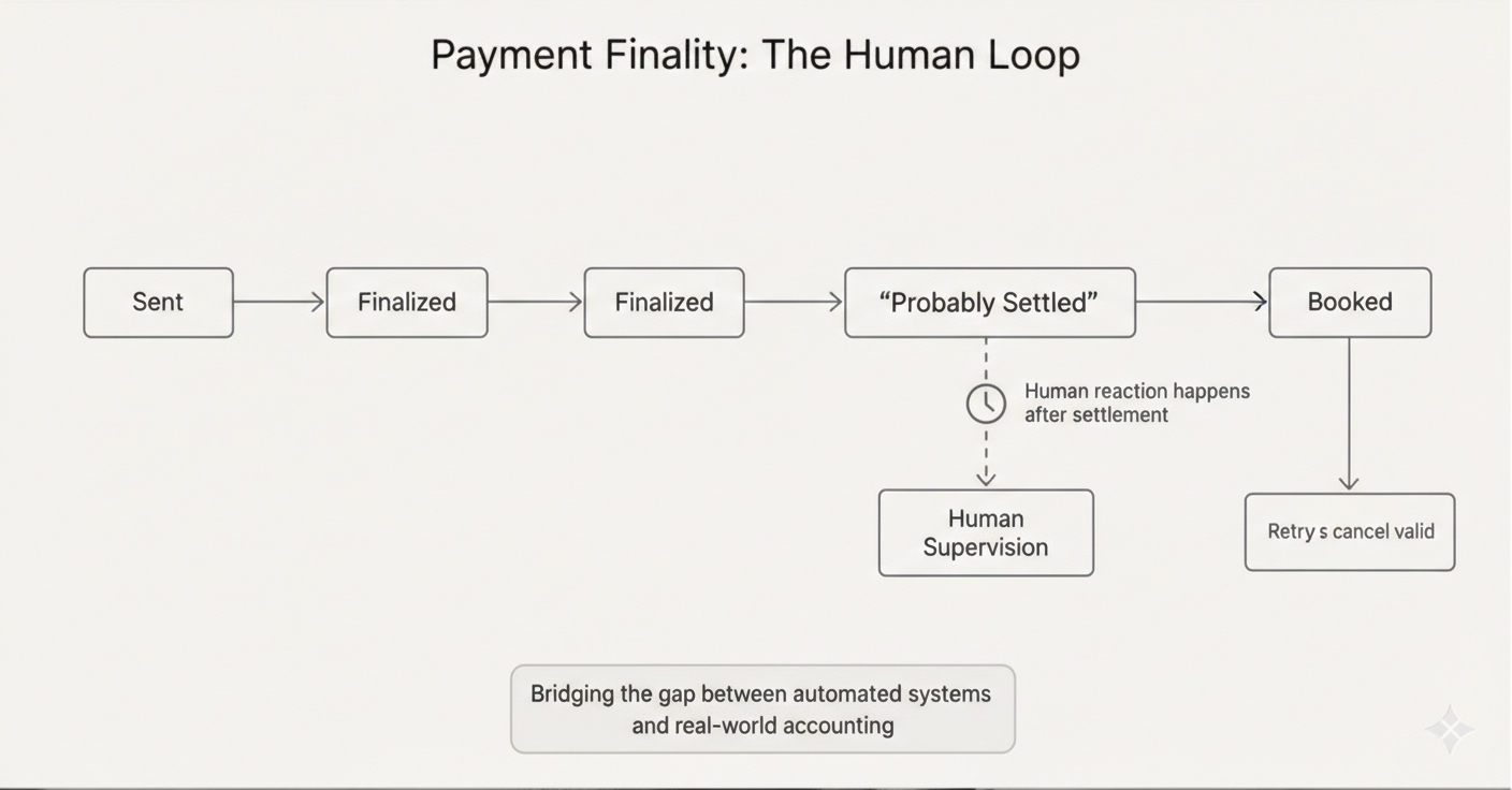 The moment humans feel allowed to disengage, the payment actually settles.