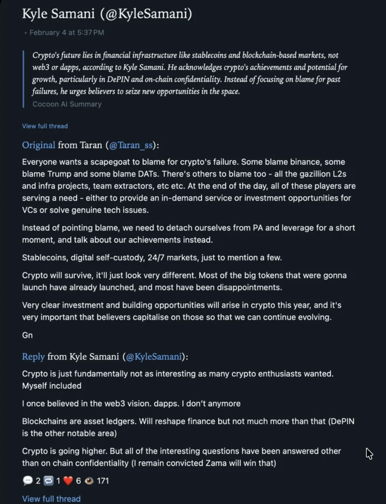"Cripto não é tão interessante quanto muitos (incluindo eu) costumavam imaginar. Eu acreditei na visão do Web3 e dApps. Agora, não acredito mais. Blockchain, em essência, é apenas um livro-razão de ativos. Ele irá reformular a indústria financeira, mas é só isso – não mais."