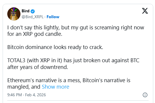 O pássaro apontou para vários sinais técnicos que apoiam a possibilidade de uma reavaliação repentina do XRP. TOTAL3, que inclui o XRP, recentemente rompeu contra o Bitcoin após anos de consolidação.