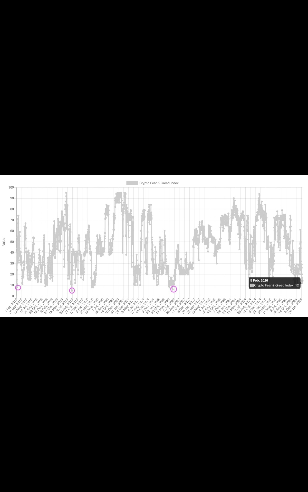 The Crypto Fear & Greed Index, which measures overall crypto market sentiment, posted an "extreme fear" score of 12 on Thursday.