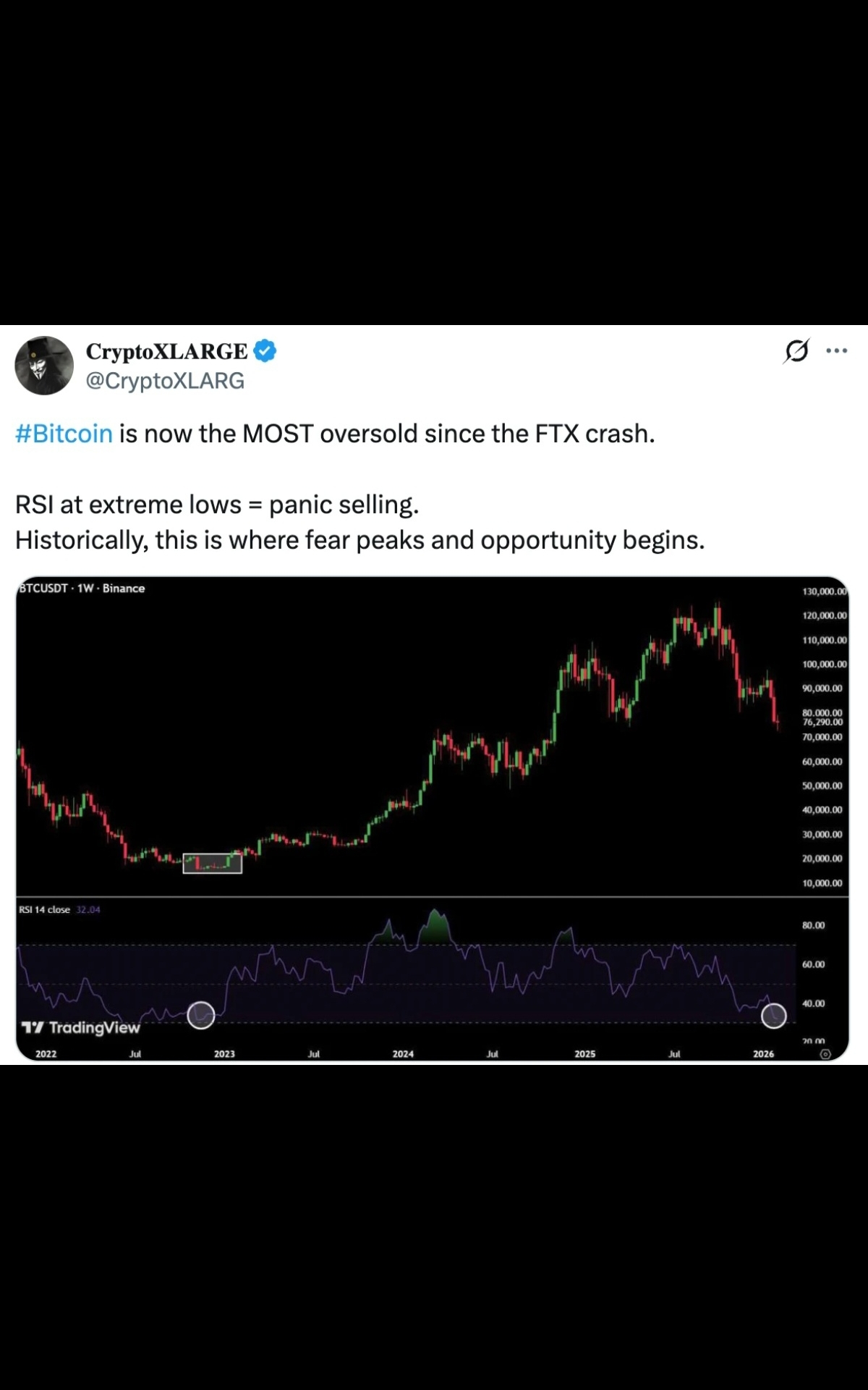 "Bitcoin is now the MOST oversold since the FTX crash," CryptoXLARGE said in an X post on Wednesday, adding that it reflects panic selling among investors.