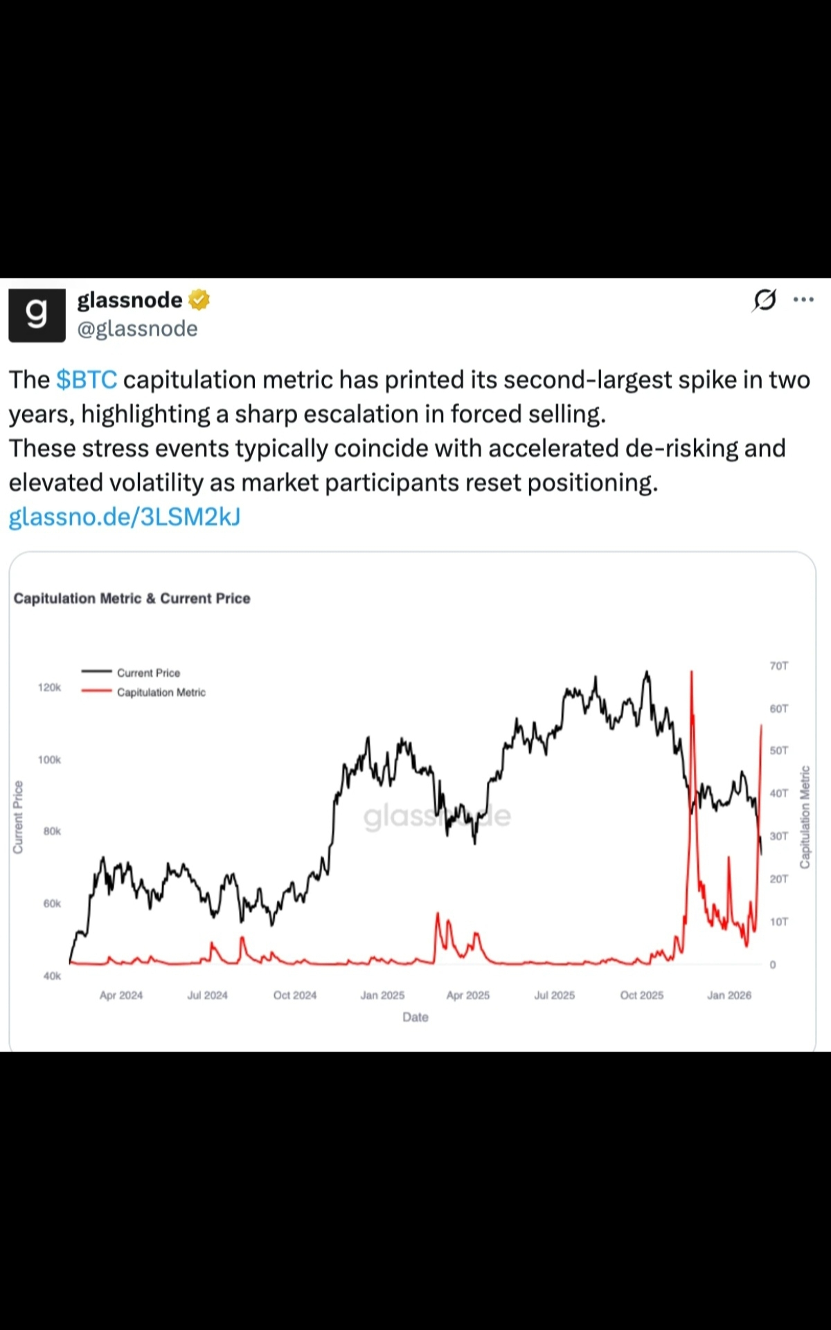 Bitcoin's capitulation metric has also "printed its second-largest spike in two years," occurrences that have previously coincided with accelerated de-risking and elevated volatility as market participants reset positioning," Glassnode said.