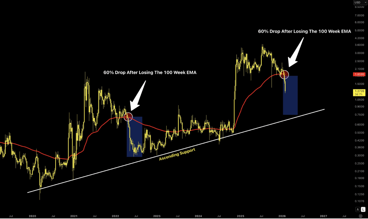 👉 XRP está atualmente exibindo uma ação de preço que se assemelha muito às estruturas de quebra anteriores após perder a EMA de 100 semanas. O analista de gráficos @ChartNerdTA aponta que movimentos históricos abaixo desse nível crítico consistentemente precederam quedas significativas, com o ciclo de baixa de 2022 servindo como o exemplo mais recente. No momento, XRP está rejeitando a média móvel e começando a se desviar para baixo em um padrão que se parece strikingly familiar com aqueles setups anteriores.