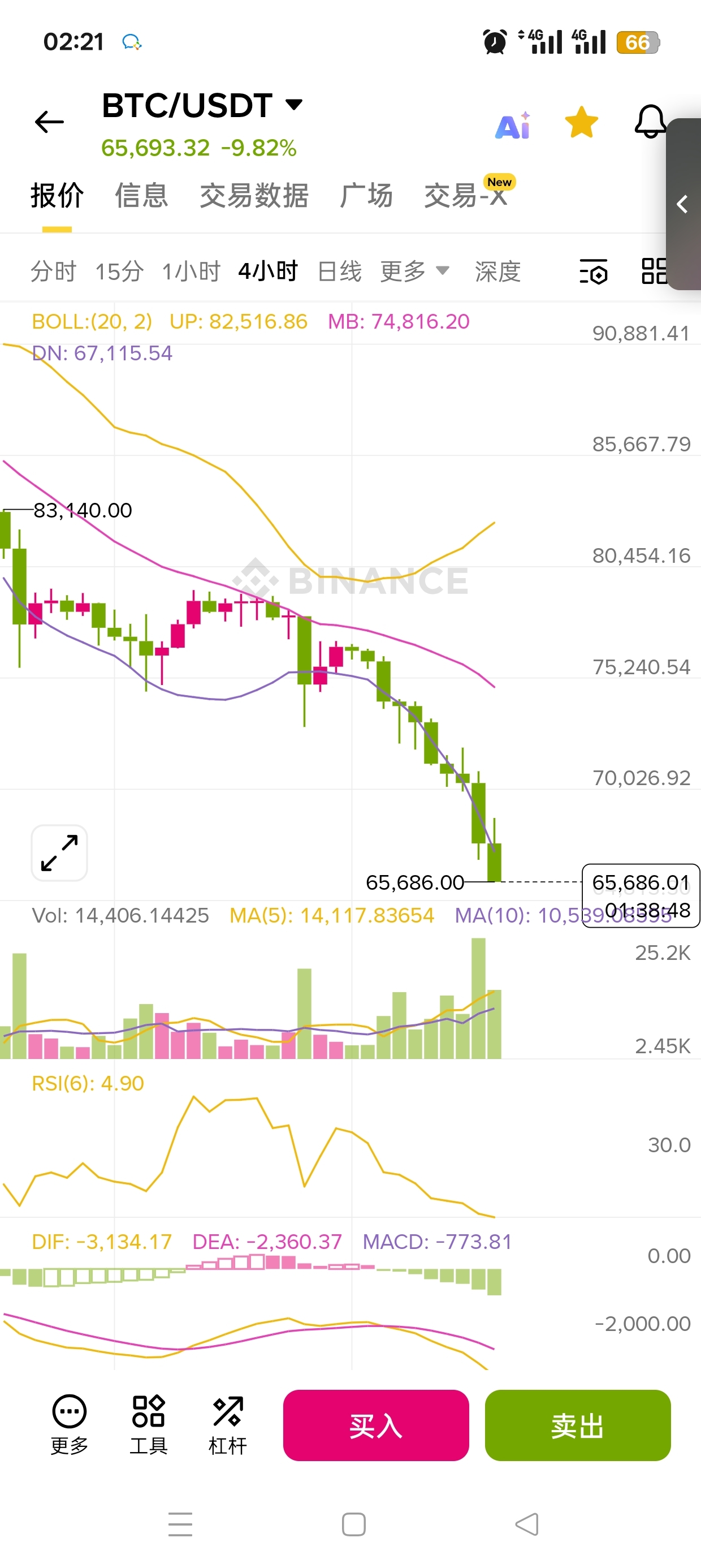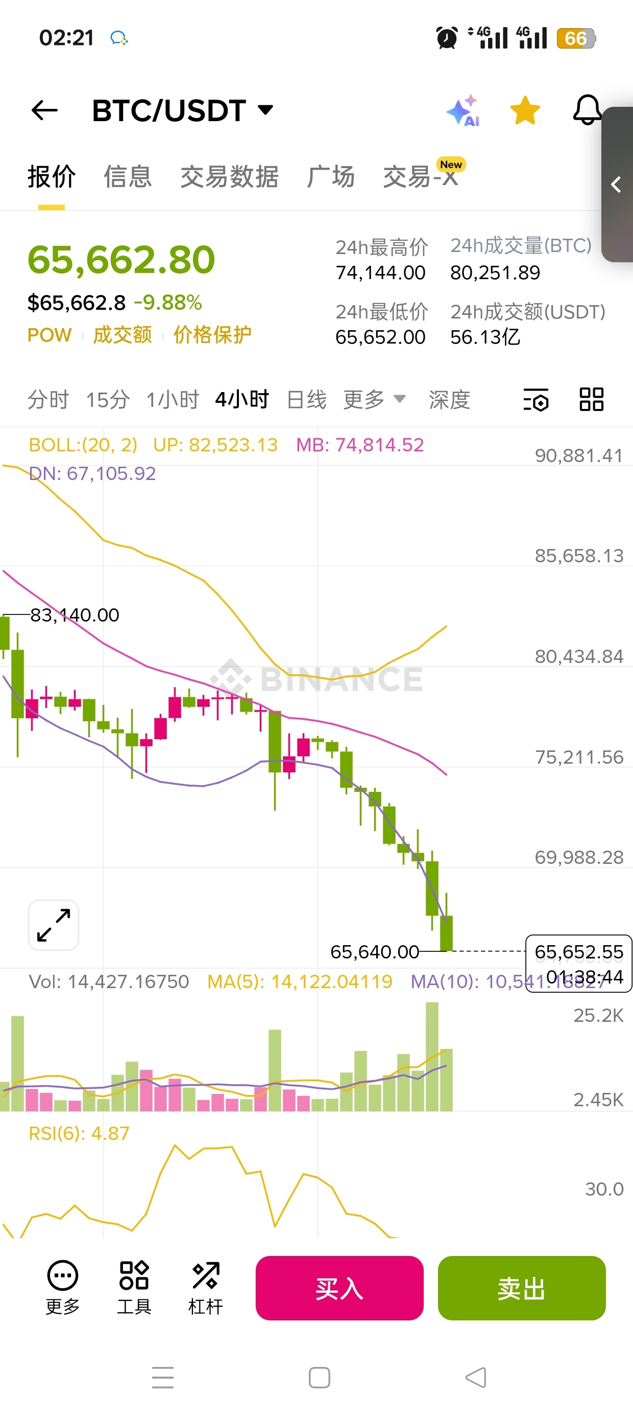 几小时前,我们还在分析六大机构地址单日流出 35 亿美元BTC 背后的博弈;现在,市场已经用一根接一根的四小时阴线回应——BTC 跌破 66,000,RSI(6) 进入 4.x 的超卖深渊,布林带下轨正成为暂时的“纸面支撑”。