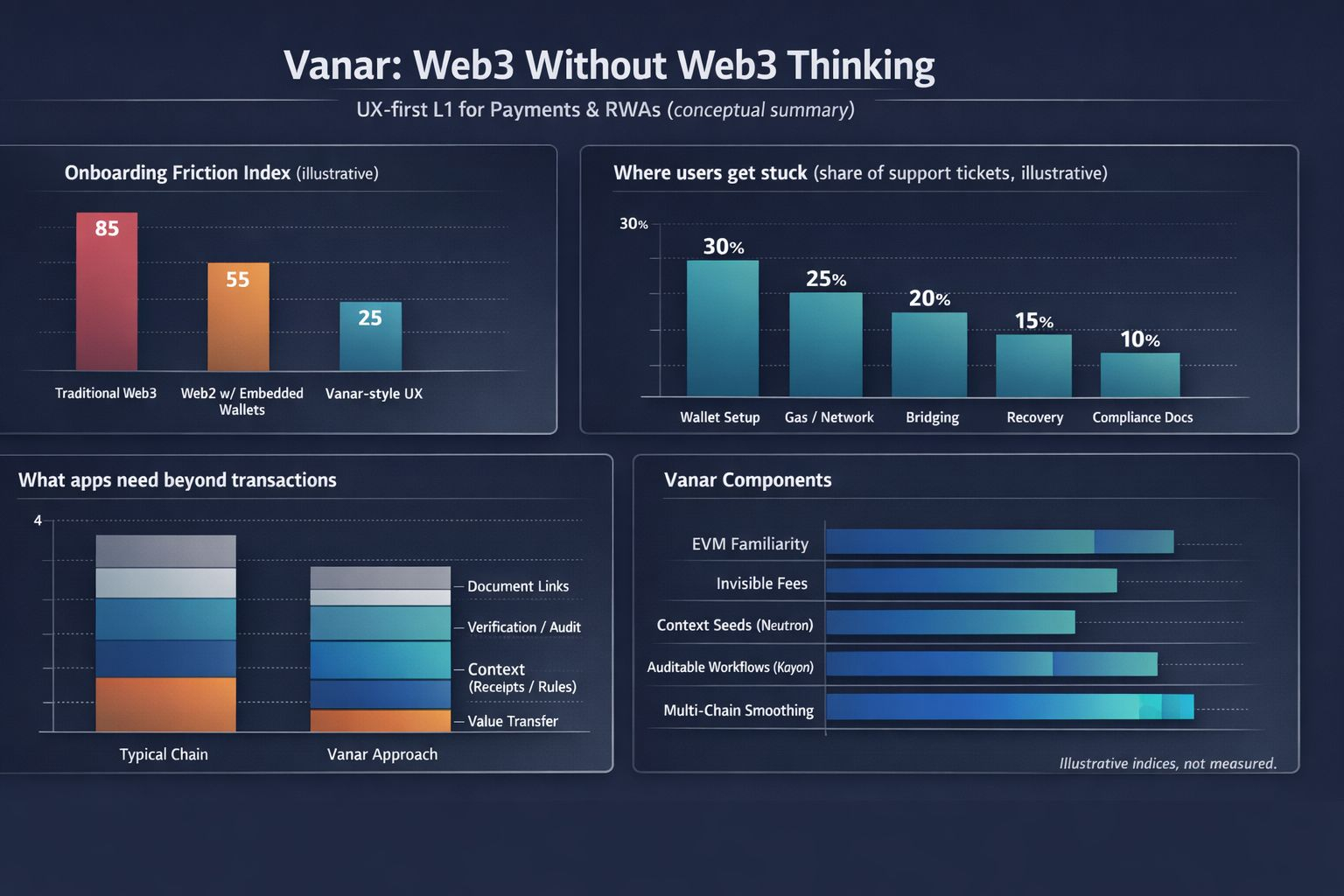 Vanar is relevant in this exact gap because it’s trying to make the machinery less visible, not more celebrated. It positions itself as a Layer 1 built for payments and tokenized real-world assets, which is a revealing choice. Payments and RWAs aren’t hobby use cases; they’re domains where the tolerance for weirdness is extremely low. If a collectible breaks, it’s annoying. If a payout fails or an invoice can’t be verified, it becomes a support ticket, a compliance problem, or a business dispute. In that world, “don’t make me think” isn’t a nice-to-have. It’s the difference between a product people adopt and one they abandon after the first confusing screen.