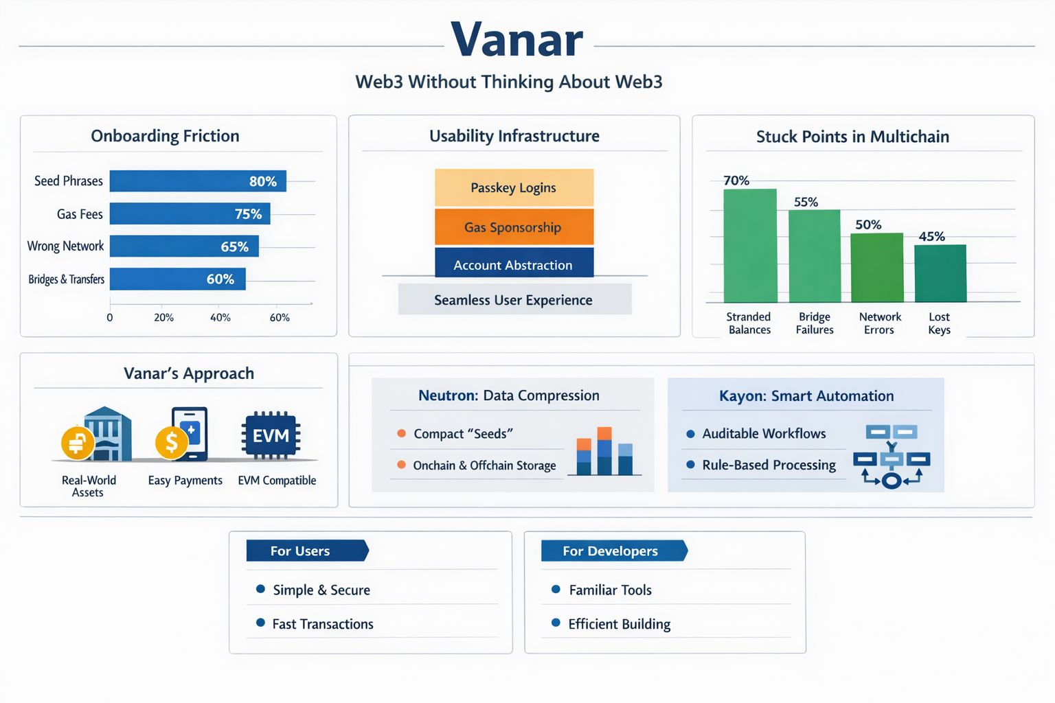 @Vanar Most people don’t wake up wanting a new chain, a new wallet, or a new set of rituals for moving value online. They want an app that works, and they want it to feel boring in the best way. When crypto products ask newcomers to copy a seed phrase, hunt for a gas token, and decode “wrong network” pop-ups, the problem isn’t only complexity. It’s the message underneath: this was built for insiders, and you’re visiting their world, not yours.