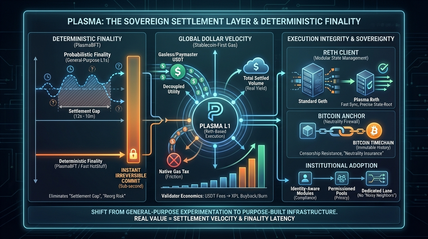 The prevailing market assumption has been that general-purpose chains would eventually optimize for payments through sheer brute-force scaling. This is a fallacy of composition. A chain that attempts to host high-frequency trading, generative NFT mints, and complex lending loops simultaneously introduces a "noisy neighbor" problem that no amount of TPS can solve. For an institution moving $500 million in a single settlement, or a merchant processing ten thousand $5 micro-payments, the risk isn't just throughput; it is the volatility of the settlement environment itself. Plasma’s decision to build on Reth a Rust-based implementation of the Ethereum Virtual Machine signals a shift from broad experimentation to narrow, high-performance execution. Reth isn't just about speed; it’s about modular state management. By utilizing a client that prioritizes efficiency and fast synchronization, Plasma ensures that its state-root can be calculated and verified with a level of precision that standard Geth-based chains simply cannot match. This technical choice is the bedrock of what we must call "Execution Integrity" the guarantee that the state of the ledger is always a true, unlagged reflection of global capital flows.