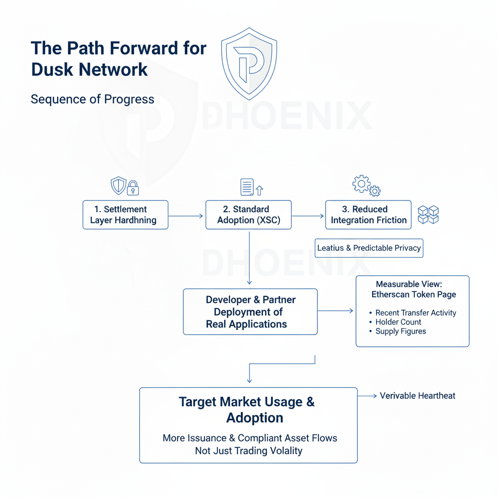 Para "o que vem a seguir", o caminho mais realista é uma sequência onde a Dusk continua solidificando a camada de liquidação, continua empurrando padrões como o XSC em fluxos de emissão prática, e continua reduzindo a fricção de integração para que desenvolvedores e parceiros possam realmente implantar aplicações reais sem lutar com a pilha. O sinal mais forte de progresso sempre será o uso que se parece com o mercado-alvo, significando mais emissões e mais fluxos de ativos em conformidade, não apenas volatilidade de negociação, e sua própria direção de roteiro público em torno da evolução modular sugere que eles entendem que a adoção é construída através da usabilidade, não apenas inovação.