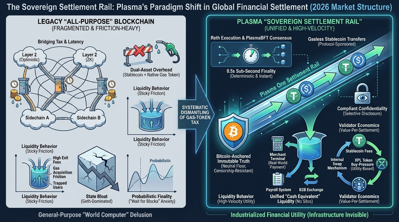 Plasma. The most significant shift in the 2026 market structure is not the rise of a new asset class, but the quiet, systematic dismantling of the gas-token tax in global financial settlement. For years, the crypto industry operated under the delusion that a general-purpose "world computer" could also serve as an efficient payment rail, ignoring the fundamental reality that high-velocity commerce cannot survive on infrastructure that requires a dual-asset overhead. Every participant who has ever been stranded with a thousand dollars in stablecoins but zero in native gas tokens knows this isn't just a UX hurdle it is a structural failure of capital efficiency. Plasma is the first credible attempt to unbundle the settlement layer from the speculative execution layer, treating the stablecoin not as a guest on the network, but as its primary reason for existence.
