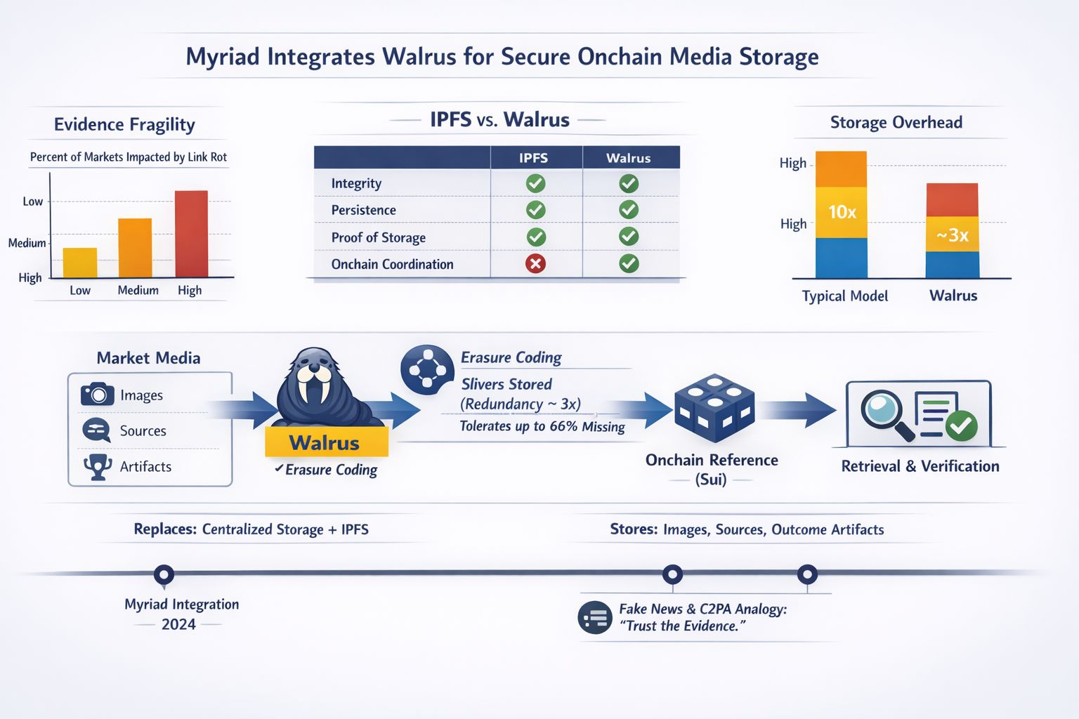 @Walrus 🦭/acc You can usually tell when a market is alive because prices move fast and people argue about what they mean. Prediction markets add a twist: the debate isn’t only about odds, it’s about evidence. A contract might settle based on a government statement, a league score page, or a single report. If that source link changes, disappears, or gets edited later, the market’s “truth” can feel fragile. That fragility sits behind Myriad’s decision to integrate Walrus and move the media attached to each market—images, supporting sources, and the final outcome artifacts—into a storage layer meant to be publicly checkable over time. Myriad’s own framing is pretty direct: Walrus replaces its prior mix of centralized storage and IPFS, so a market’s context is harder to quietly rewrite after people have traded on it.