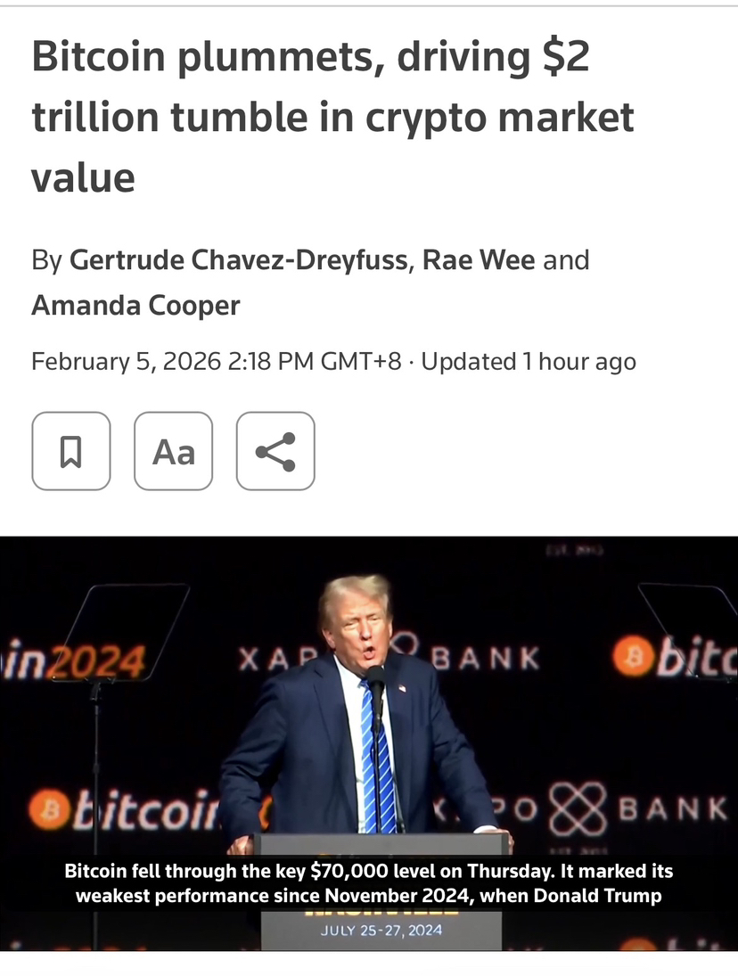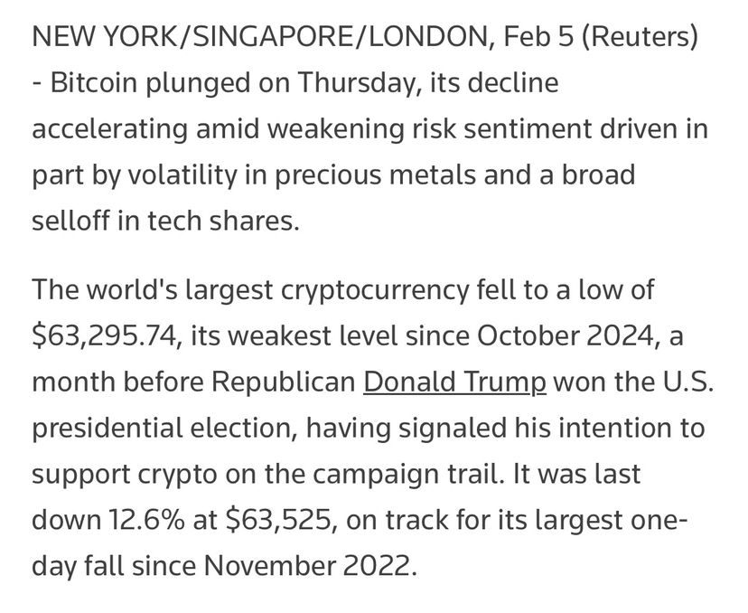 A Reuters expressou claramente: o BTC caiu quase 12% em um único dia, a maior queda diária desde 2022/11, acompanhada por liquidações em larga escala e colapso da preferência de risco no mercado.