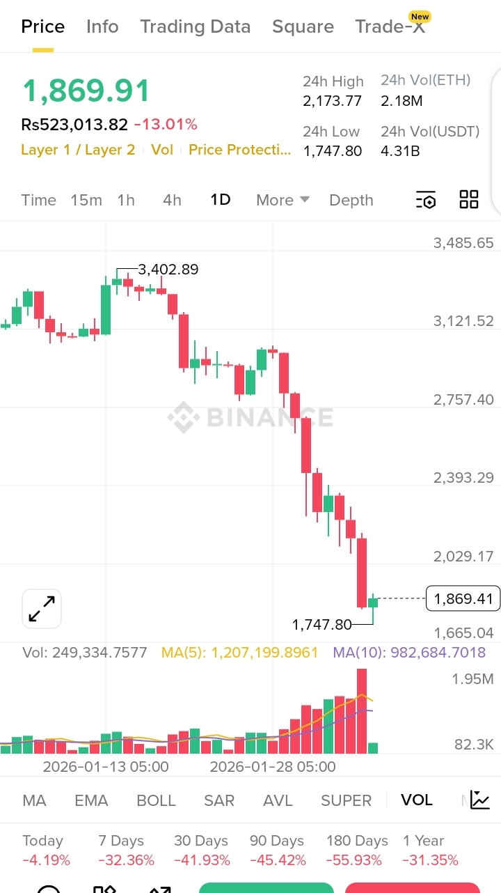 O ETH atingiu o pico perto de 3.400 e então entrou em uma tendência de baixa persistente marcada por saltos fracos e forte pressão de venda. A falha técnica mais importante ocorreu quando o Ethereum perdeu 3.000. Esse nível havia atuado como suporte psicológico e estrutural por meses. Uma vez quebrado, os vendedores aceleraram.