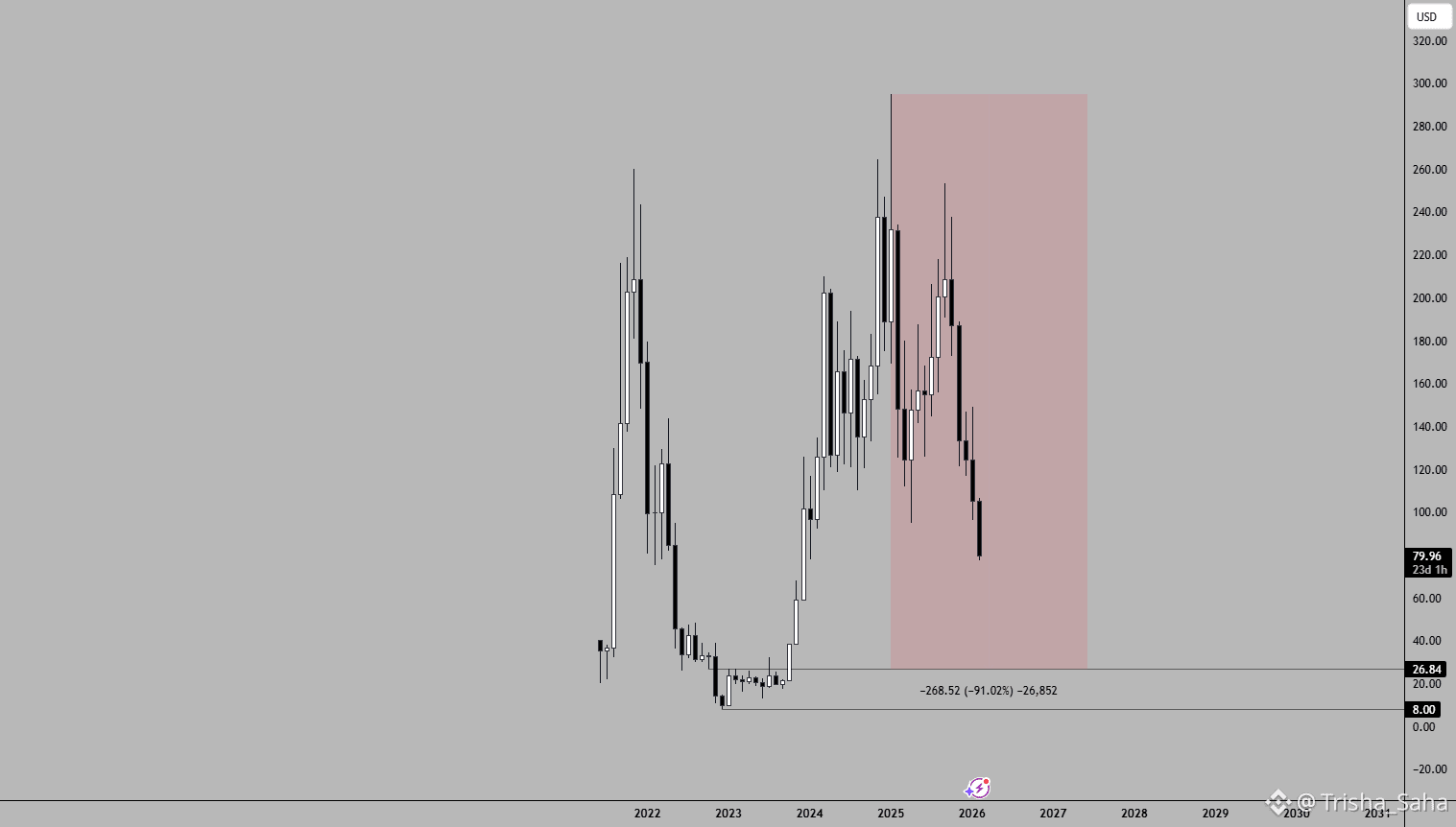 Historically, assets that move like this don’t bottom on minor pullbacks. They reset deep. 80–90% drawdowns aren’t anomalies — they’re part of the cycle.