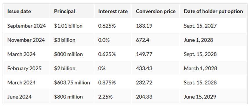 这74亿的可转债,首笔有10亿美元在2027年9月15日到期,另有64亿美元可能在2028年到期,加上利息,一起是82亿刀。