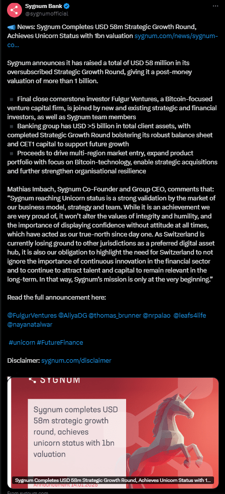 Într-un anunț din 14 ianuarie, banca a dezvăluit că runda de finanțare a fost suprasubscrisă, investitorul principal fiind Fulgur Ventures, o firmă de capital de risc concentrată pe Bitcoin. Alți participanți au inclus investitori noi și existenți, împreună cu membri ai echipei Sygnum.