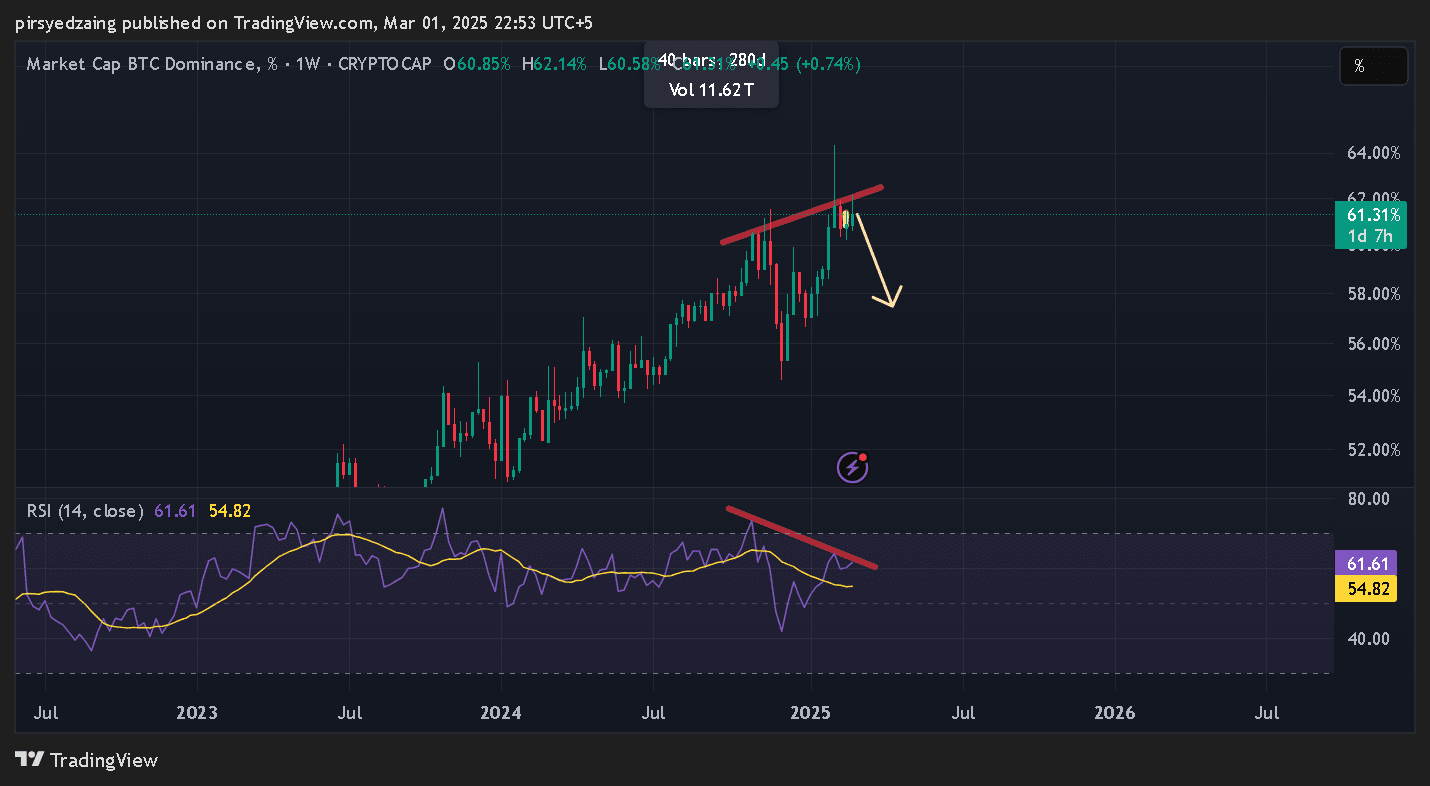 👉 BTC.D pe intervalul de timp săptămânal formează o divergență bearish, formând maxime mai mari în dominanță și minime mai mici pe RSI.