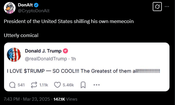 Moneda meme $TRUMP a avut un angajament ridicat pe rețelele sociale. Aceasta este în relație cu autorizarea publică a președintelui Donald Trump, unde este menționat ca "cel mai mare dintre toți." Această nouă atracție îi face pe comunități să anticipeze impactul asupra performanței de piață a monedei.