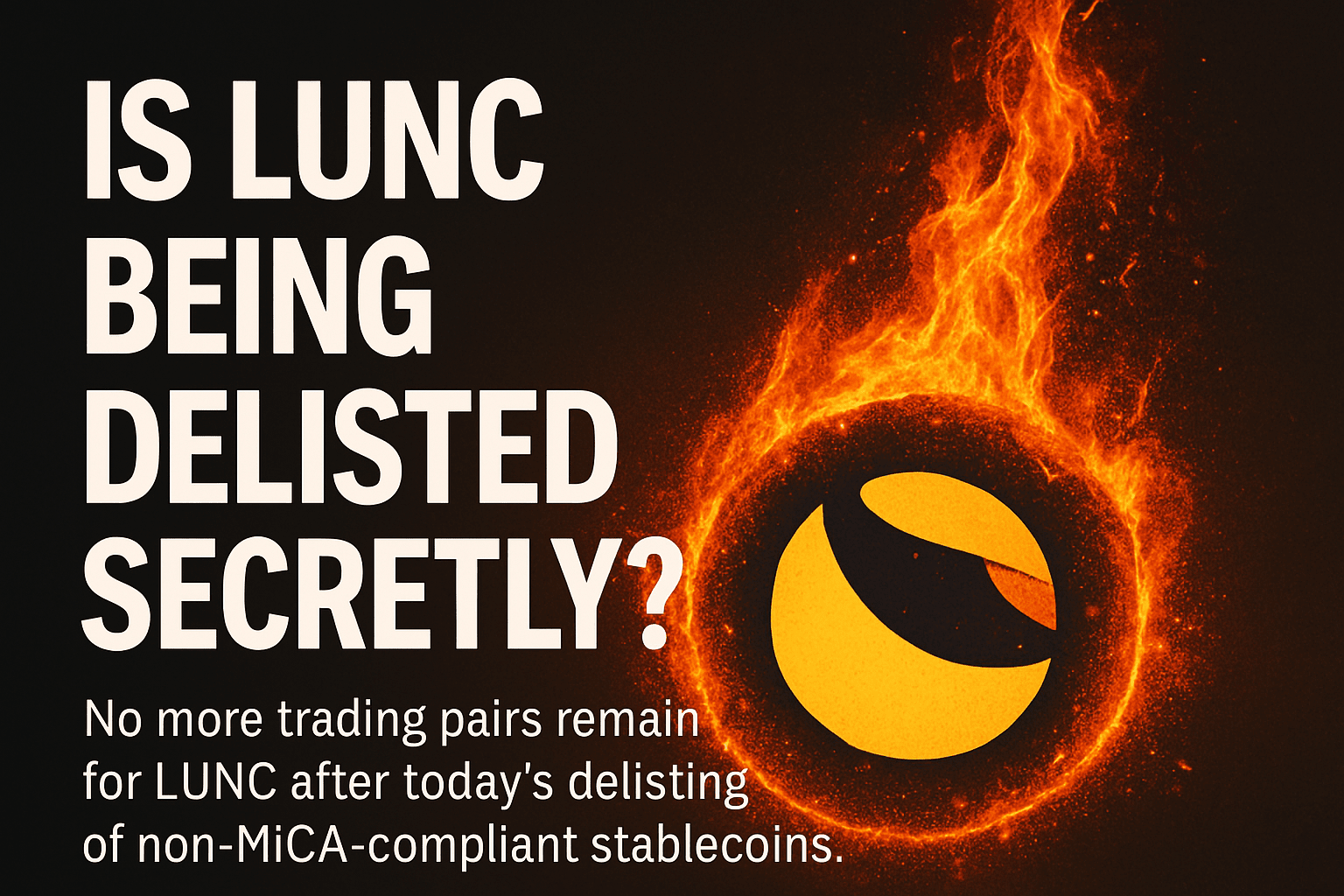 Răspunsul se află în noua reglementare MiCA, care interzice toate stabilcoinurile neconforme de la tranzacționare. Binance implementează asta astăzi prin eliminarea tuturor perechilor de tranzacționare cu stabilcoinuri neconforme MiCA. Și iată problema pentru LUNC: Fără perechi de tranzacționare rămase, moneda nu mai poate fi tranzacționată!
