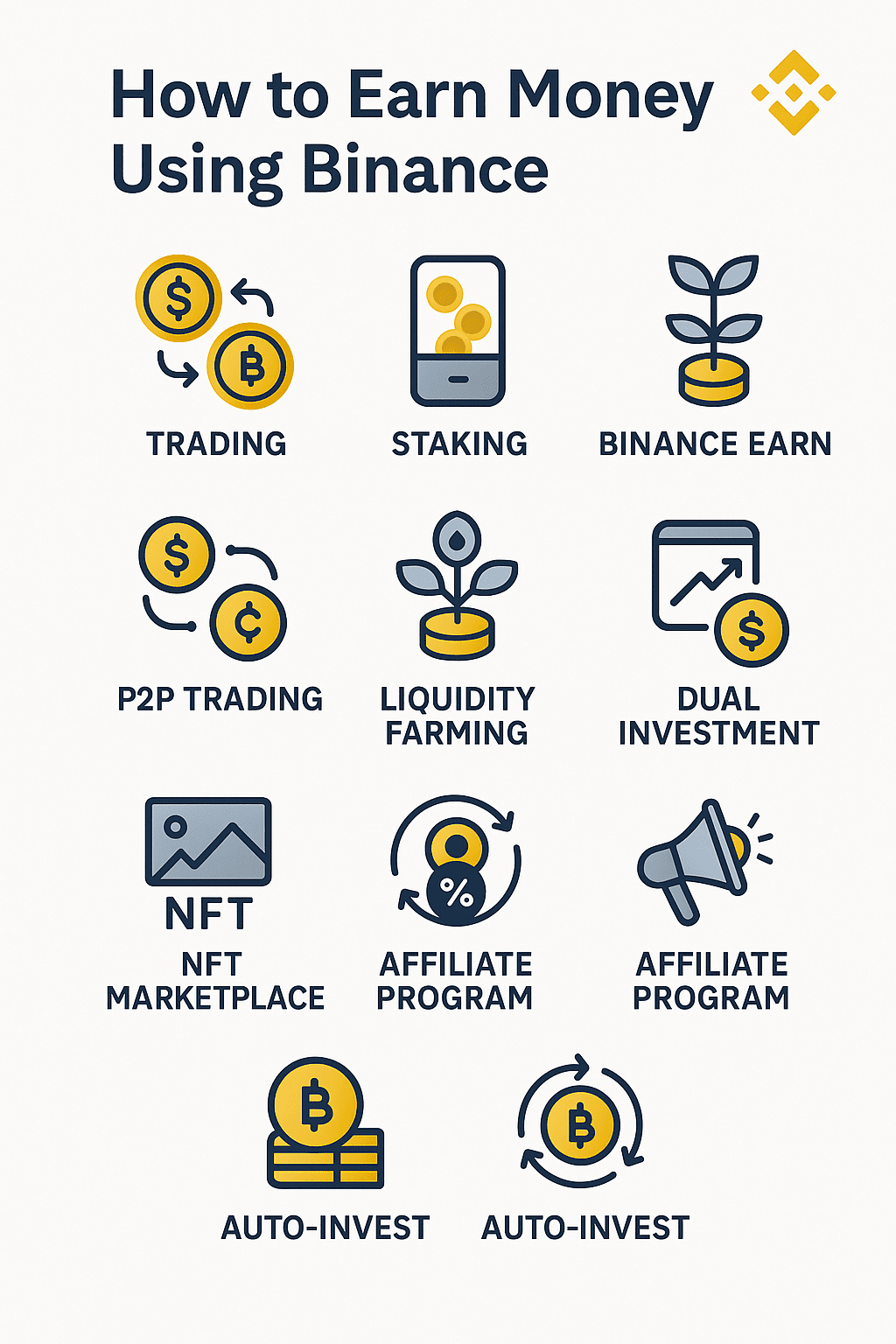 Întrebare excelentă! Binance oferă multiple modalități de a câștiga bani, dar este important să ne amintim că investițiile în cripto vin cu riscuri. Iată un ghid pas cu pas care acoperă toate posibilitățile principale: